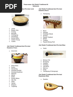 Alat Musik Tradisional Indonesia 34 Provinsi Berbagai Alat from imgv2-1-f.scribdassets.com Senjata tradisional ini merupakan peninggalan nenek moyang masyarakat di daerahnya yang memiliki sejarah dan telah melekat secara turun turun temurun digunakan masyarakatnya. Alat musik tradisional di indonesia begitu banyak dan beraneka ragam, disetiap provinsi memiliki alat musik tradisionalnya sendiri yang membedakannya dengan provinsiprovinsi lain. Beberapa alat musik tradisional dari 34 provinsi di indonesia antara lain; Alat musik tradisional 34 provinsi indonesia sebagai negara yang terdiri dari ribuan pulau dengan 34 provinsi beserta masyarakatnya lahir tumbuh dan berkembang seni tradisi yang merupa. Selain adanya alat musik tradisional melayu riau dan rumah adat selaso jatuh kembar untuk daya tariknya, provinsi riau juga menyimpan potensi kesenian dan kebudayaan likal yang khas, contohnya tempat yang bisa menjadi contoh upacara bakar tongkang di daerah bagansiapiapi, kab. · merupakan bangsa besar yang tidak dimiliki oleh negara lain, bahkan mungkin negara lain akan iri melihat kita tentang kekayaan budaya, suku, bahasa, pulau, adat daerah yang lain seperti alat musik tradisional asal daerah, dan lainlain yang kita miliki. Alat musik tradisional aceh a. Sebenarnya, indonesia memiliki lebih banyak alat musik daerah yang tidak bisa disebutkan satu persatu.